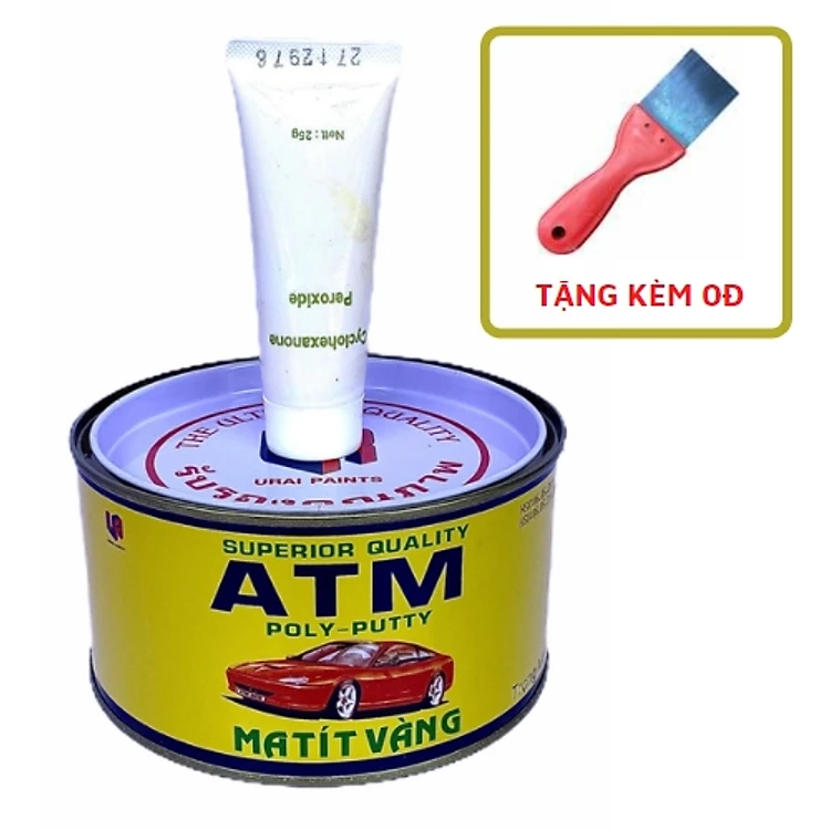 - Bộ sản phẩm gồm một hộp bả matít màu vàng 1kg + 1 lọ phụ gia matít 25g