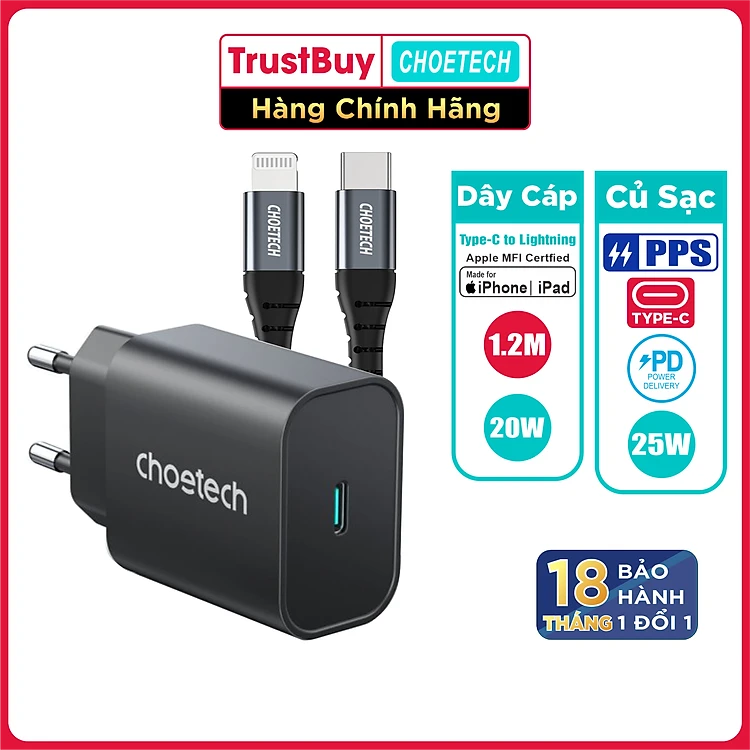 Combo Củ Sạc Nhanh 25W CHOETECH PD6003 Và Cáp Type C to Lightning MFI 20W Dây Nylon Dài 1.2m IP0039 Dành Cho iPhone iPad - Hàng Chính Hãng