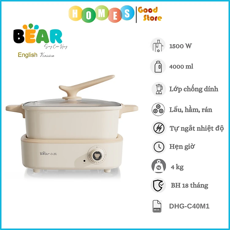 Nồi điện đa năng kèm bếp Bear DHG-C40M1 là món đồ gia dụng không thể thiếu trong mọi căn bếp. Sản phẩm có thiết kế thông minh tích hợp bếp điện, nồi đa năng kèm nồng hấp giúp bạn chế biến nhiều món ăn như: Nấu lẩu, nấu canh, món luộc, món hấm, chiên, rán, thay thế được nhiều dụng cụ nhà bếp khác nhau. Cùng trải nghiệm ngay tại Bear Việt Nam nhé!