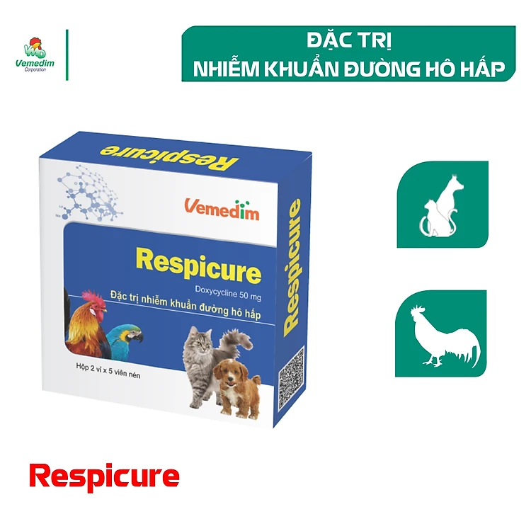 Vemedim Respicure - Doxycycline 50mg Trị các nhiễm khuẩn đường hô hấp trên chó mèo, chim cảnh, bồ câu, gà cảnh, gà đá.