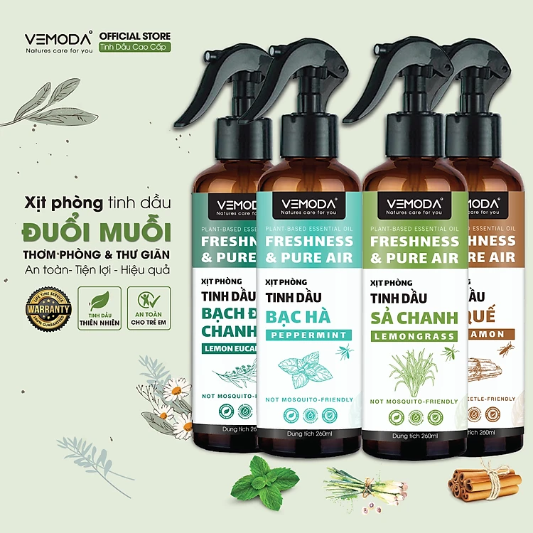 Bình Xịt phòng tinh dầu Sả Chanh, Bạc hà, Quế, Bạch đàn chanh Vemoda giúp hỗ trợ đuổi muỗi, thơm phòng nhanh chóng. Chai xịt hỗ trợ đuổi muỗi từ tinh dầu thiên nhiên