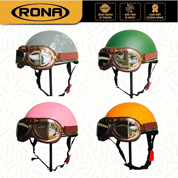 Mũ bảo hiểm xe máy 1/2 RONA haly viền bạc kèm kính phi công viền đồng cao cấp chính hãng