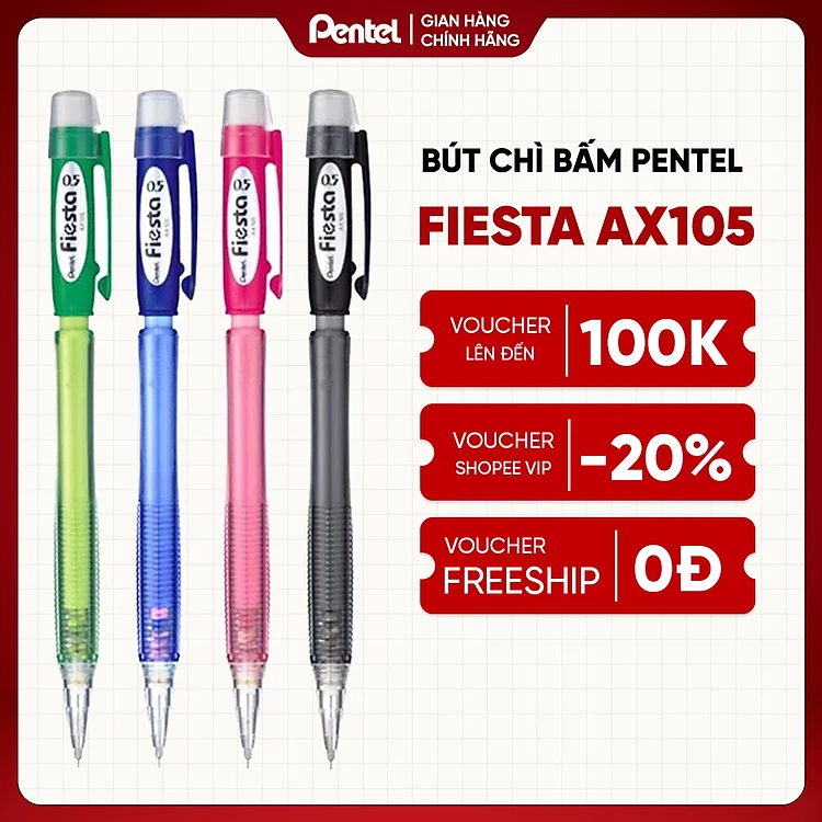 Bút chì kim Pentel Fiesta AX105 (0.5mm) và AX107 (0.7mm) trang bị đầu tẩy 4 màu lựa chọn