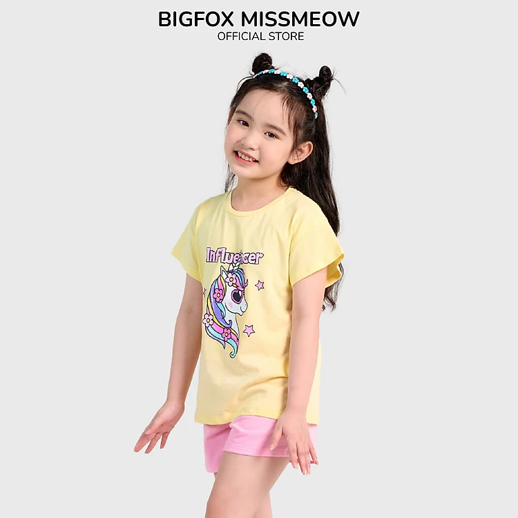 Bộ Đồ Quần Áo Cộc Tay Cho Bé Gái Missmeow Mặc Mùa Hè Chất Liệu Cotton In Hình Kỳ Lân Pony Size Đại Trẻ Em 3,4,5,6,7,8 Tuổi