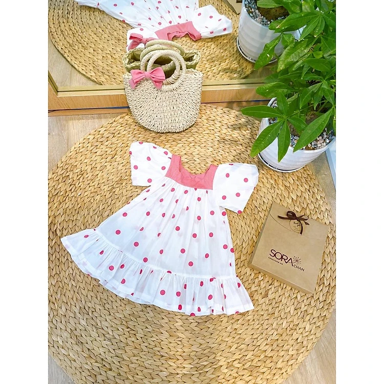 Váy Đầm Tay Chuông Cổ Vuông Chấm Bi Hồng SoraChan - M040