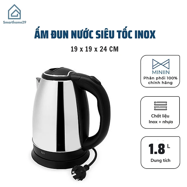 Ấm Đun Nước Siêu Tốc Inox 1.8L Cao Cấp, Bình Đun Nước Nóng Cách Nhiệt An Toàn, Tiện Dụng - Chính hãng MINIIN