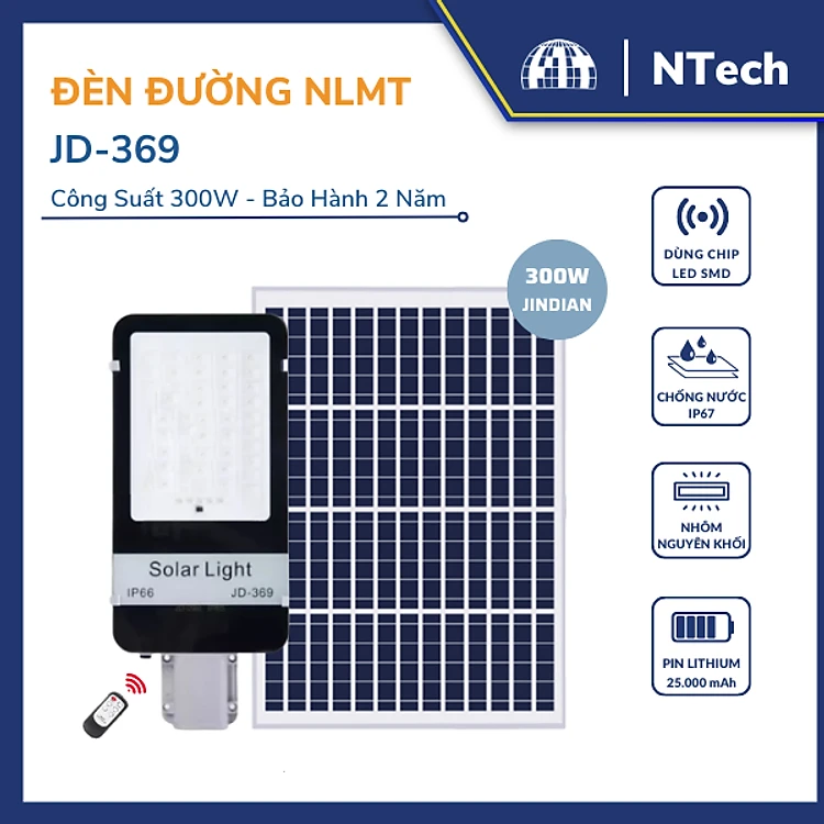 Đèn đường năng lượng mặt trời Jindian JD-369 Công suất 300W Khung Nhôm, Chip Led "SMD"- Lumen cao