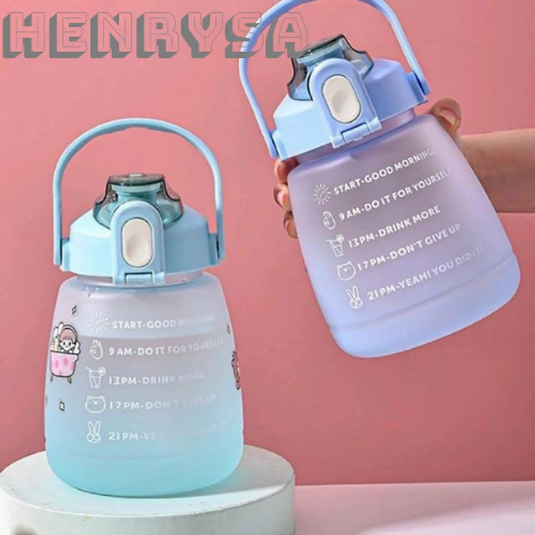 Bình Nước Có Vạch Báo Giờ Uống Nước Dễ Thương 1.3L (Tặng kèm dây đeo) - HENRYSA