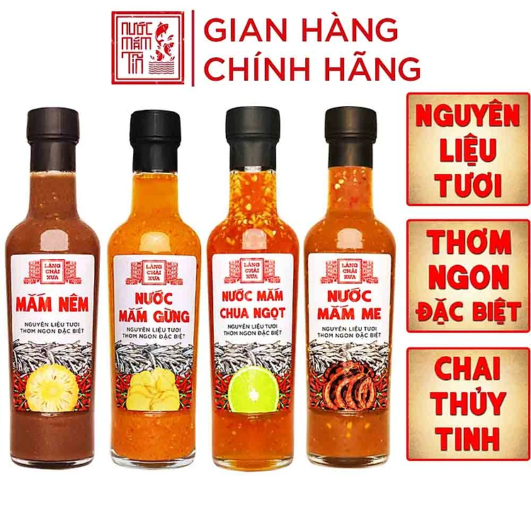 Combo 4 chai nước chấm pha sẵn (Mắm nêm, Nước mắm chua ngọt, Nước mắm gừng, Nước mắm me) Làng Chài Xưa nguyên liệu tươi