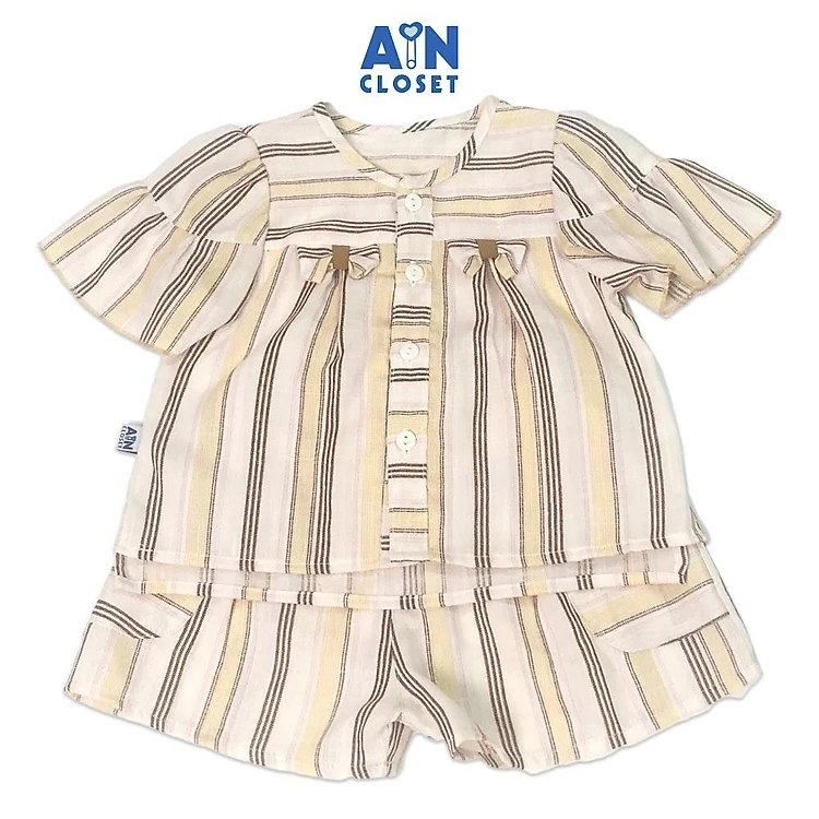 Bộ quần áo ngắn bé gái họa tiết Kẻ nâu tay rũ cotton - AICDBGEXMU4L - AIN Closet