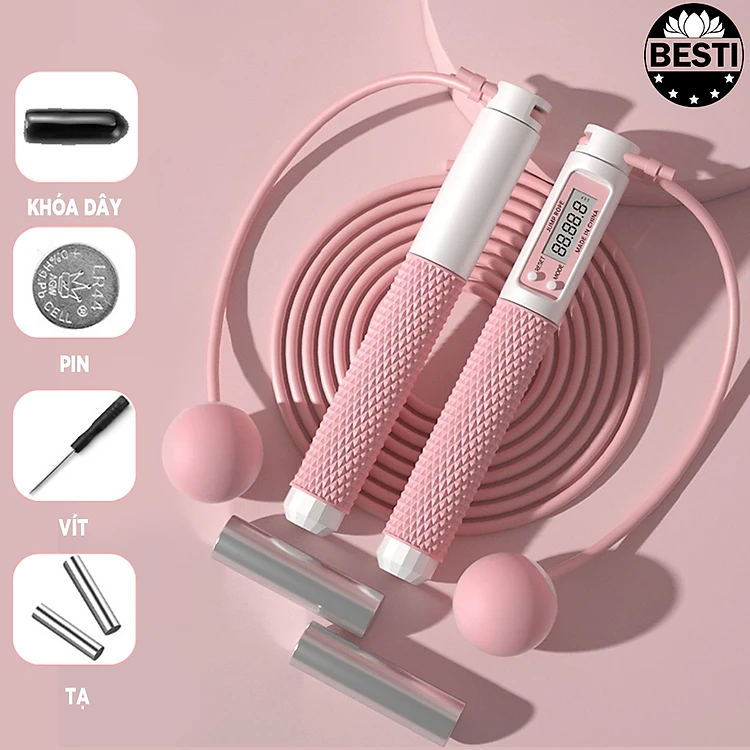 Dây Nhảy Thể Thao Lõi Thép Cao Cấp Besti Tự Động Đếm Số, Tích Hợp Đo Calo, Quãng Đường, Độ Dài Dây Tùy Chỉnh - Kèm Bóng Xoay Và Tạ Điều Chỉnh Khối Lượng - Hàng Chính Hãng
