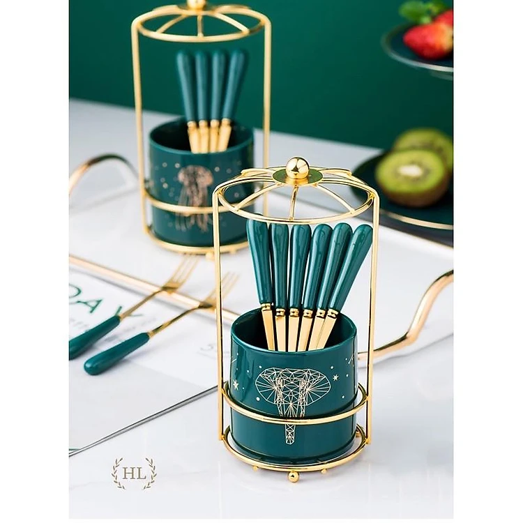 Gồm ống đựng muỗng nĩa bằng sứ có khung bao bên ngoài, 6 nĩa inox 304 có tay cầm bằng sứ màu xanh ngọc lưu ly cực kỳ sang trọng.
