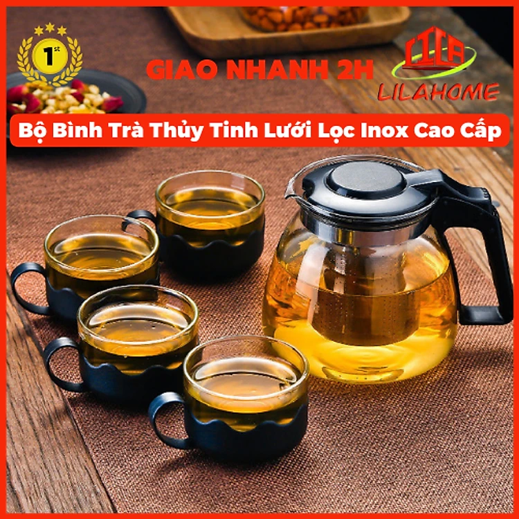 Bộ Bình Trà Thủy Tinh Kèm 4 Ly Lưới Lọc Inox 304 Không Gỉ Tiện Lợi - Hàng Chính Hãng