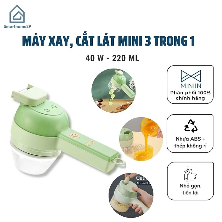 Máy xay mini cầm tay 3 trong 1 (máy xay nghiền tỏi ớt, rau củ, sinh tố;, máy nạo gọt hoa quả; máy cắt sợi, thái lát đồ ăn) dễ dàng vệ sinh - Chính hãng MINIIN (Giao màu ngẫu nhiên)