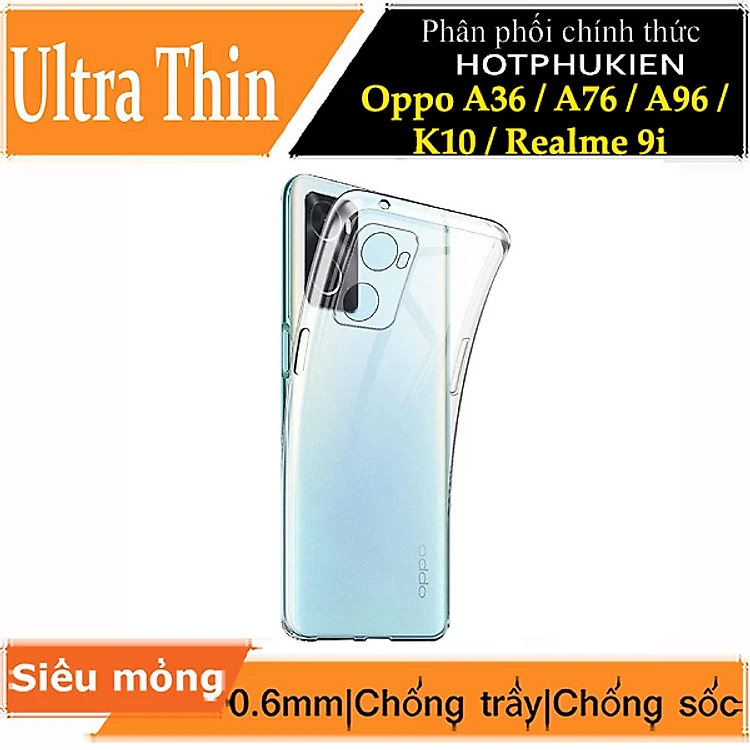 Ốp lưng silicon dẻo cho Oppo A36 / Oppo A76 / Oppo A96 / Oppo K10 / Realme 9i hiệu Ultra Thin trong suốt mỏng 0.6mm độ trong tuyệt đối chống trầy xước - Hàng nhập khẩu