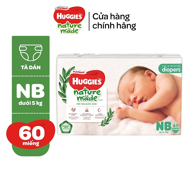 Tã/Bỉm dán sơ sinh Huggies Platinum NatureMade - Gói Super Jumbo S82/ NB60 - Hàng chính hãng