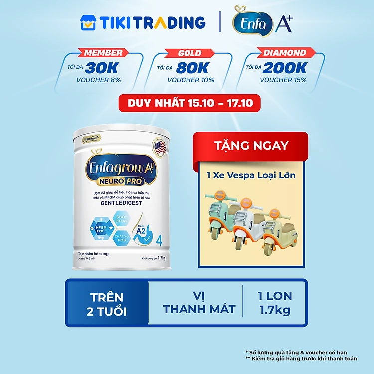 Sữa bột Enfagrow A2 Neuropro 4 1.7kg giúp dễ tiêu hóa, hấp thu dành cho trẻ 3-6 tuổi