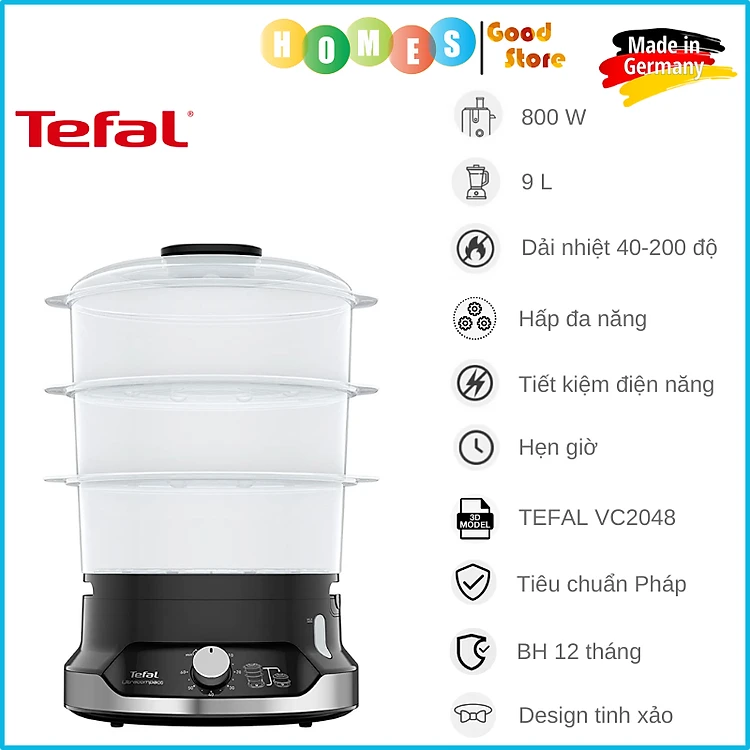 Nồi Hấp Điện 3 Tầng TEFAL Ultra Compact VC2048, Sản Xuất Tại Pháp, Hẹn Giờ Thông Minh, Dung Tích 9L, Công Suất 800W - Hàng Nhập Khẩu Đức