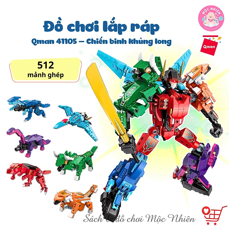 Đồ chơi xếp hình, lắp ráp 6 in 1 Qman 41105 – Chiến binh khủng long (512 mảnh ghép) dành cho bé trai trên 6 tuổi
