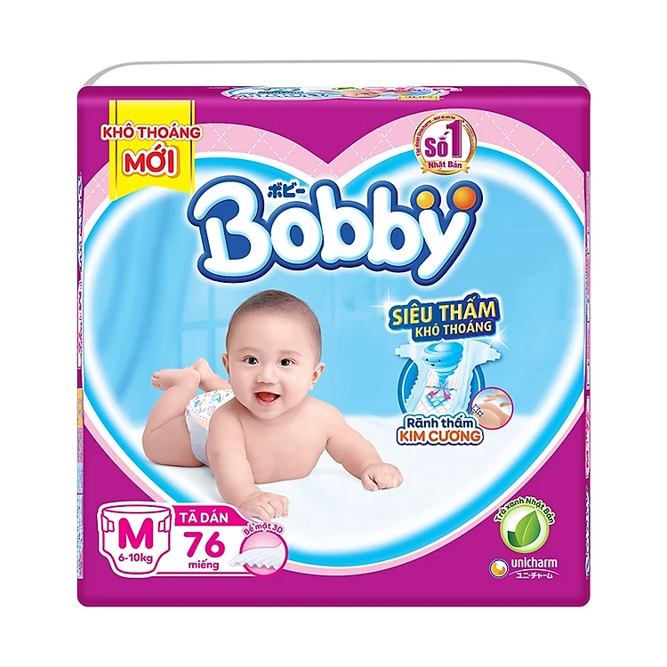 Tã dán siêu mỏng Bobby mang đến cho bé những giờ phút vui chơi thỏa thích và những giấc ngủ thật sâu và ngon. Để làm được điều ấy, thương hiệu Unicharm Nhật Bản đã nghiên cứu và sản xuất sản phẩm với những đặc điểm nổi bật như: hệ thun Magic Fit linh hoạt, ôm vừa vặn bụng bé, đai dính trước bụng dạng vải cotton mềm mại, an toàn cho làn da non nớt, bề mặt tã 3D siêu thấm siêu thoát ẩm, Sản phẩm sẽ là lựa chọn hoàn hảo của mẹ giúp chăm sóc sức khỏe bé trog những năm tháng đầu đời.
