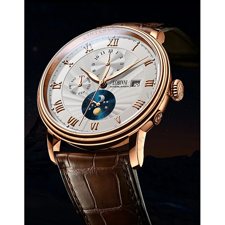Đồng hồ nam chính hãng LOBINNI LB11023G-D1 Kính sapphire chống xước,chống nước 50m,mặt trắng vỏ vàng hồng dây da nâu xịn, thép không gỉ 316L,Đồng hồ cơ (Automatic) bảo hành 24 tháng,thiết kế đơn giản và sang trọng
