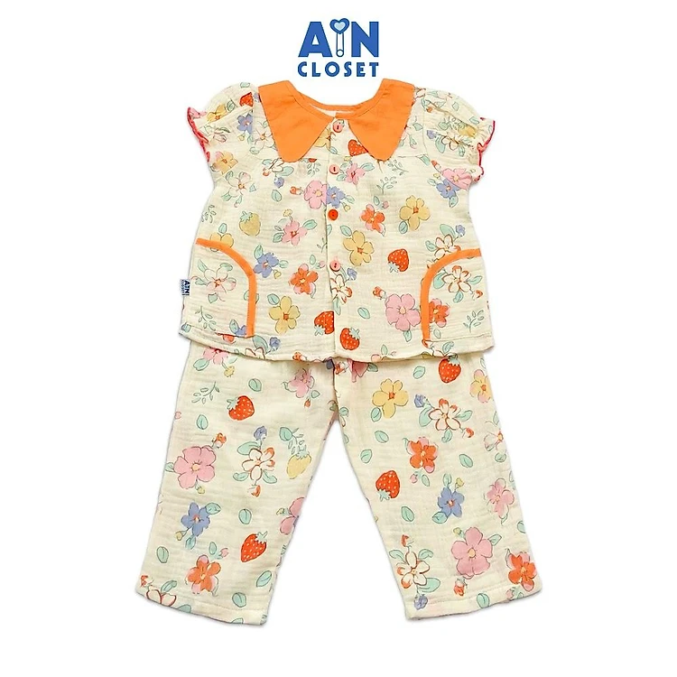 Bộ quần áo dài tay ngắn bé gái họa tiết Hoa Dâu cổ cam xô muslin - AICDBGTDX5FC - AIN Closet
