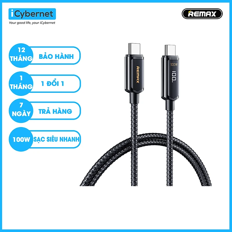 Cáp sạc siêu nhanh 100W TypecC to TypeC Remax RC-128a tích hợp đồng hồ đo công suất sạc - Hàng chính hãng
