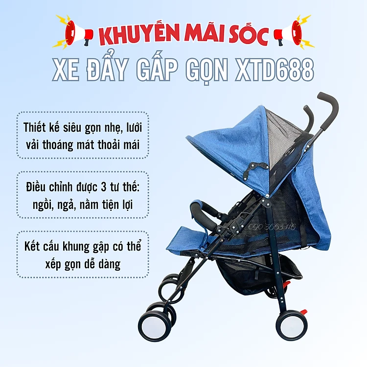 Xe đẩy cho bé cao cấp XD688 - Xe đẩy kéo du lịch gấp gọn siêu nhẹ, siêu thoáng, siêu bền lưới chống tia UV