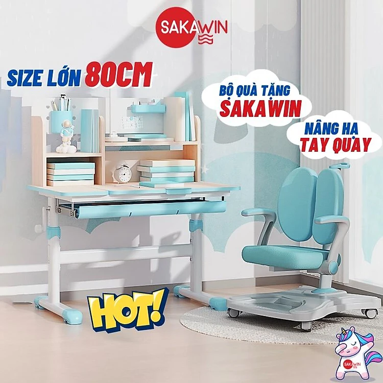 Bộ bàn học cho bé Sakawin S80 và Ghế G90 mới nhất, Bàn học sinh có giá sách Nâng hạ tay quay, Giá Nhập