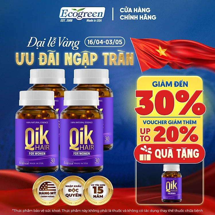 [Tặng Hộp 15v] Combo 4 Hộp 30v - Viên Uống Mọc Tóc Qik Hair For Women Ecogreen Giảm Rụng Tóc Cho Nữ
