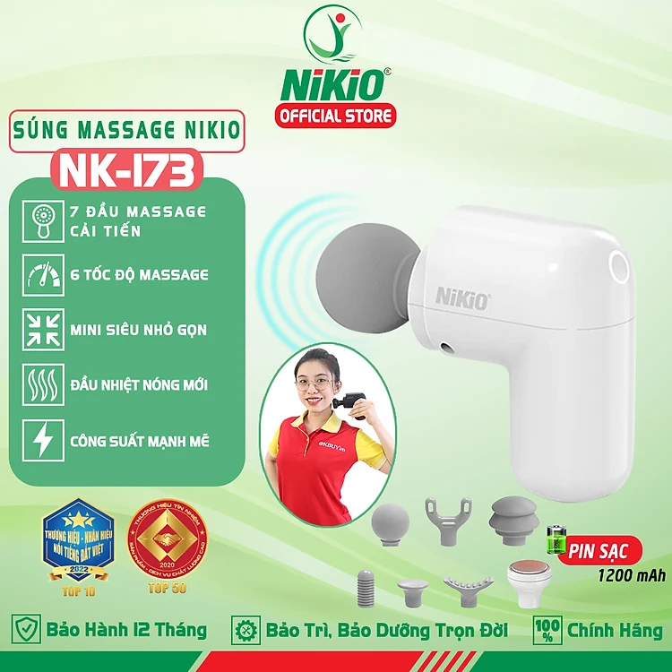 Súng Massage Cầm Tay Mini Nikio NK-173 - 6 Đầu Chuyên Dụng + 1 Đầu Nhiệt Nóng - Mát Xa Hỗ Trợ Giảm Đau Nhức Và Giãn Cơ Toàn Thân - Phù Hợp Mọi Đối Tượng, Siêu Nhỏ Gọn