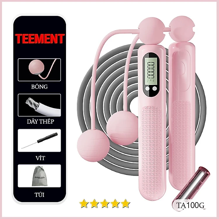 Dây Nhảy Thể Thao Lõi Thép Cao Cấp Teement Tự Động Đếm Số, Tích Hợp Đo Calo, Quãng Đường, Độ Dài Dây Tùy Chỉnh, Chiều Dài 3m, Trục Xoay 360 Độ - Kèm Bóng Xoay, Tạ Điều Chỉnh Khối Lượng - Hàng Chính Hãng