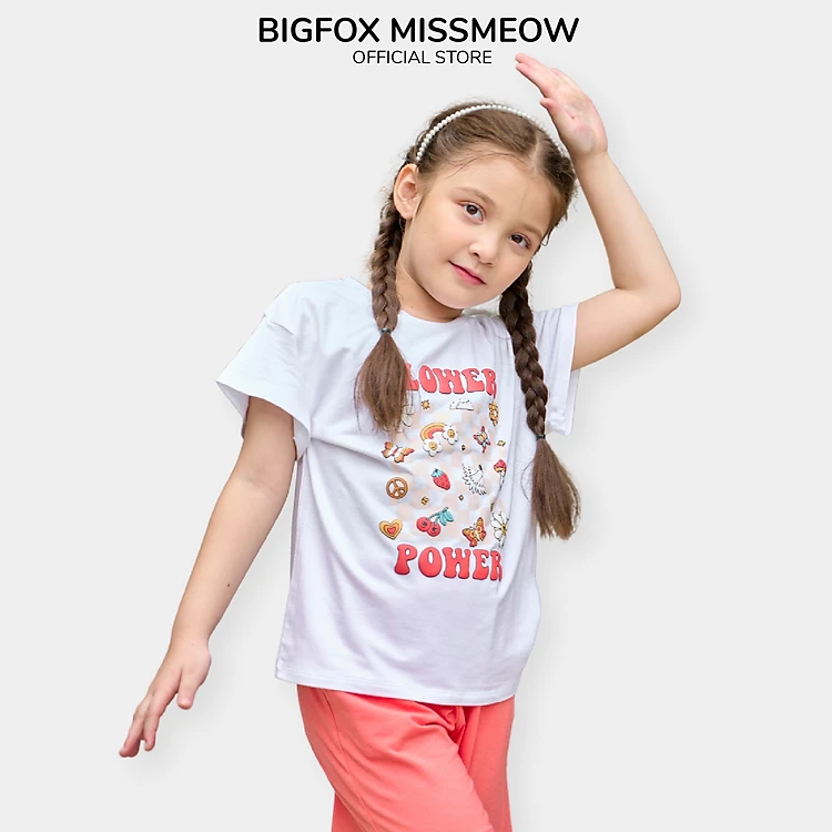 Đồ bộ cộc tay bé gái Bigfox Miss Meow size đại mùa hè vải cotton kiểu Hàn Quốc in Flower Power cỡ 3-11 tuổi 25kg 30kg
