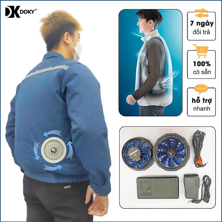 Bộ Áo Điều Hòa DOKY Nhật Bản Chất Liệu Vải Kaki Cao Cấp, PIN Dung Lượng Cao 30.000mAh, Quạt Không Chổi Than 12V Chạy Bền Khỏe - Màu Xanh Than