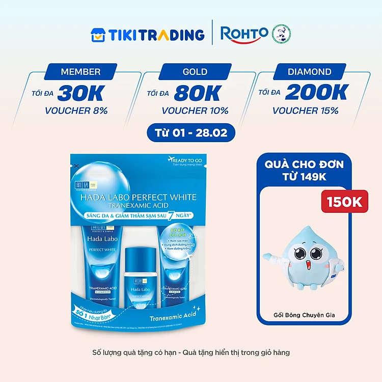 Bộ travel size dưỡng trắng Hada Labo Perfect White Tranexamic Acid Travel Set (Kem rửa mặt 15g+Dung dịch dưỡng 20ml+Kem dưỡng 12g)