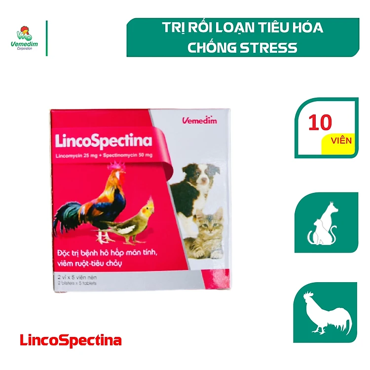 Vemedim LincoSpectina trị nhiễm trùng đường hô hấp và tiêu hóa cho cho chim, gà cảnh, chó, mèo, hộp 10 viên/hộp 50 viên