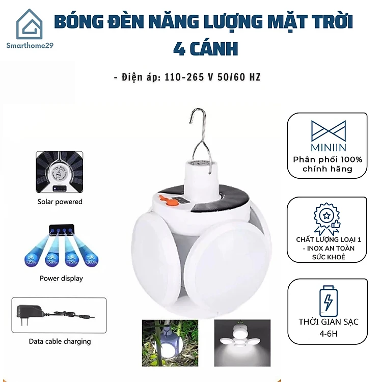 Bóng Đèn Tích Điện 40W , Năng Lượng Mặt Trời 4 Cánh ,Đèn Led Siêu Sáng ,Tiết Kiệm Điện Năng , Chống Nước - HÀNG CHÍNH HÃNG MINIIN