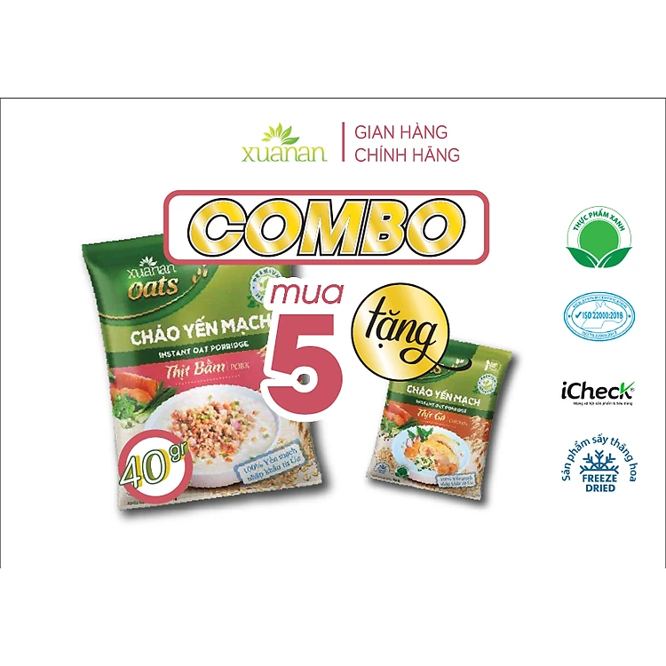 Gói cháo: yến mạch nguyên chất (60%), phôi cháo gạo.