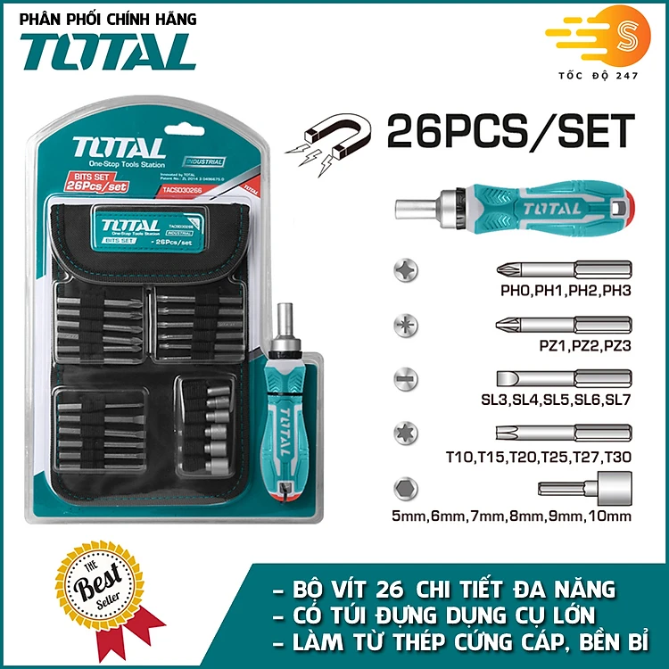 Bộ tua vít đa năng 26 chi tiết có túi đựng TOTAL TACSD30266 - Nhiều loại đầu vít, chất liệu thép chuyên dụng, tay cầm chắc chắn