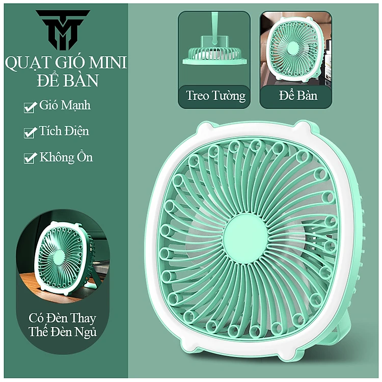 Quạt Mini Để Bàn, Quạt Tích Điện Usb Teement, Quạt Cầm Tay 3 Tốc Độ, Tích Hợp Đèn Ngủ, Điều Chỉnh Hướng Gió 180 Độ, Không Gây Ồn, Pin Sạc Dung Lượng Cao - Hàng Chính Hãng