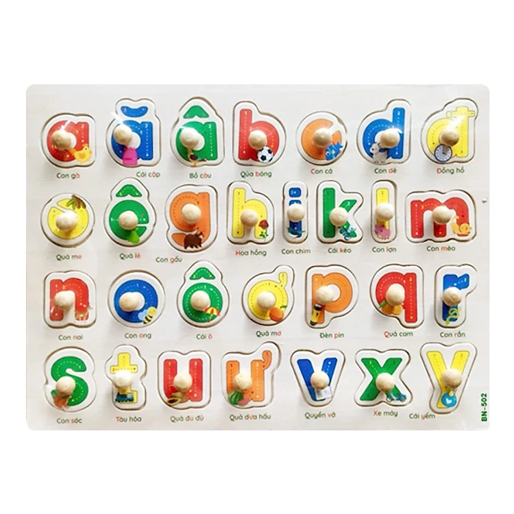 - Tương ứng với mỗi chữ cái là một núm gỗ, bé có thể cầm nắm, lắp vào tháo ra dễ dàng. Ngoài ra mỗi chữ cái kèm theo một đồ vật, trái cây, con vậ tương ứng để bé nhận biết thêm nhiều sự vật xung quanh.