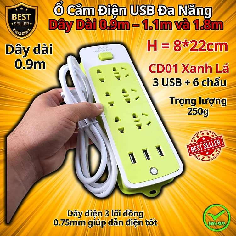 9 ổ cắm thông thường và 3 cổng USB, phù hợp cho nhiều thiết bị.