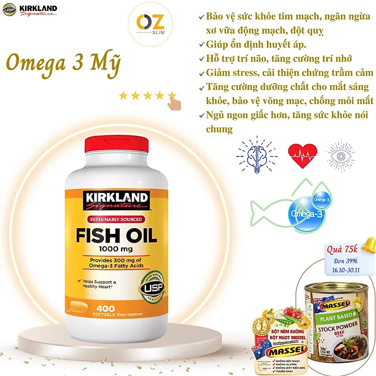 Omega 3 Mỹ Kirkland Signature Fish Oil 1000mg Hỗ trợ sức khỏe não bộ, hệ thần kinh, Tim mạch, Khớp, Bổ mắt, Làm đẹp da - OZ Slim Store