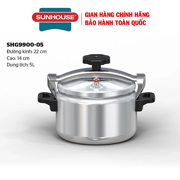 Nồi áp suất Sunhouse SHG9900-04, SHG9900-05, SHG9900-06, Dung tích 4L, 5L, 6L, Chất liệu nhôm nguyên chất bền bỉ, Sử dụng trên bếp gas và bếp hồng ngoại, không dùng được bếp từ - Hàng chính hãng