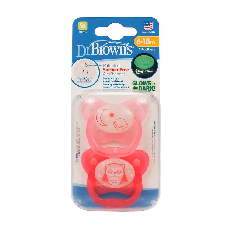 [ PV22006/07 - Hồng ] Set 2 ty ngậm phát sáng dạ quang Prevent chỉnh nha, chống vẩu Dr.Brown's ( 6-18m )