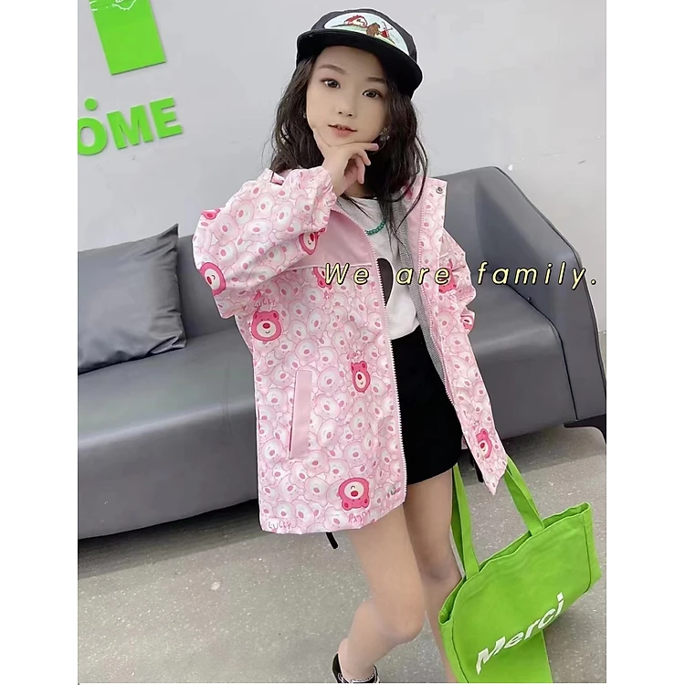 Áo khoác gió cho bé gái size đại, Áo gió trẻ em 5-12 tuổi phối màu và hình Gấu cao cấp lót cotton hàng Quảng Châu