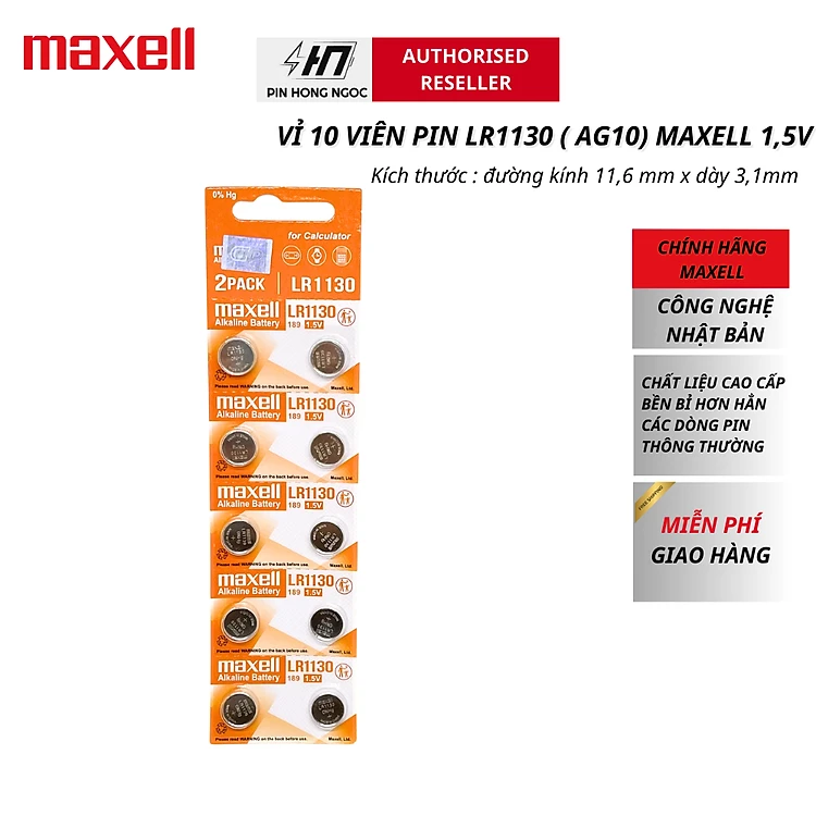 Vỉ 10 Viên Pin LR1130 ( Pin AG10 , Pin LR54 ) Maxell 1,5V Chính Hãng
