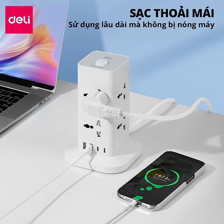 Ổ cắm điện đa năng Deli Công Suất 2500W - Tích Hợp Ổ USB & Type C Thiết Kế Cầu Chì Tự Ngắt Khi Quá Tải, Nắp Chống Giật