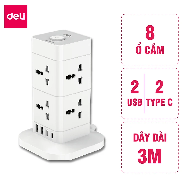 Ổ cắm điện đa năng Deli Công Suất 2500W - Tích Hợp Ổ USB & Type C Thiết Kế Cầu Chì Tự Ngắt Khi Quá Tải, Nắp Chống Giật