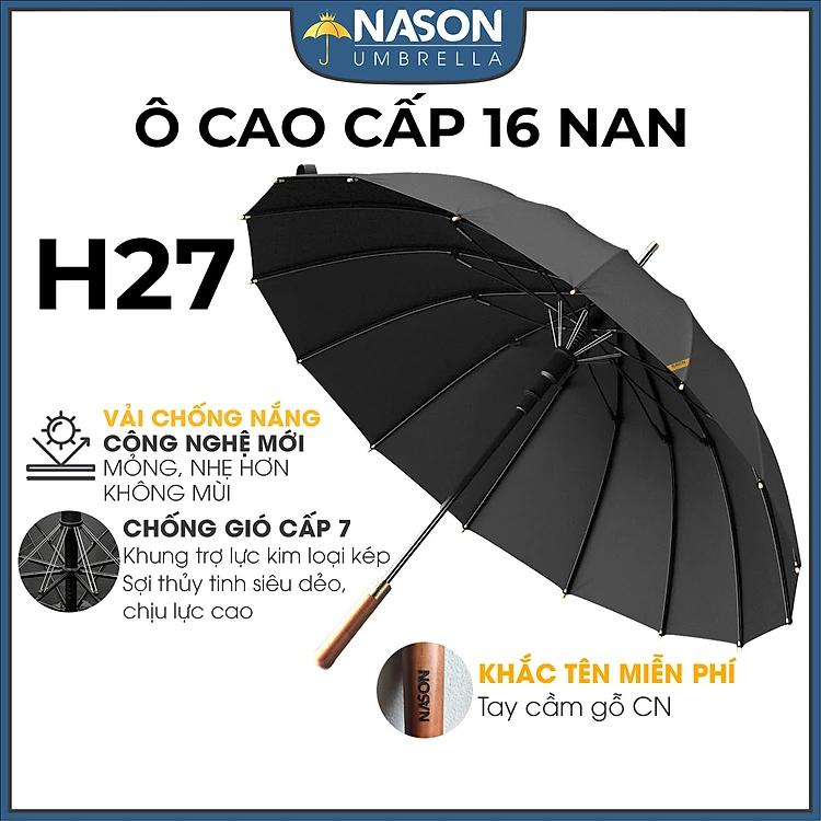 Ô dù tán rộng che nắng mưa H27 NASON, 16 nan, khắc tên lên tay cầm gỗ, chống lật trong gió to, che 2 3 người